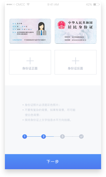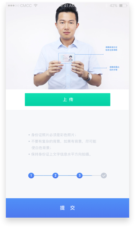 通过打通公安部人口库、银联用户库,充分保证了用户身份信息的真实性; 通过人脸识别、OCR识别等技术认证用户实名身份和真实意愿。