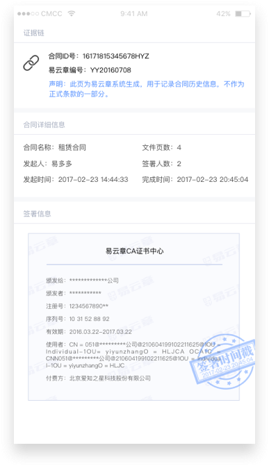 易云章电子签名服务提供实名认证、时间戳、电子签名和存证等服务, 可嵌入到客户应用系统中来形成电子证据,并通过打通司法机构来达到为客户证明数据真实性的目的。